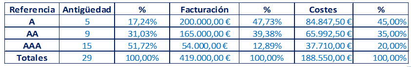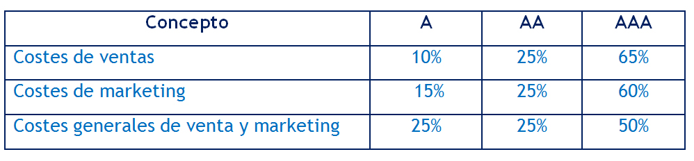 Finalmente, fruto de una reunión mantenida con la dirección del departamento de ventas sobre el tiempo invertido en la gestión de pedidos, resolución de incidencias, asesoramiento… con los centros de formación, se acordó la siguiente tabla de imputación de costes para la cartera de clientes: